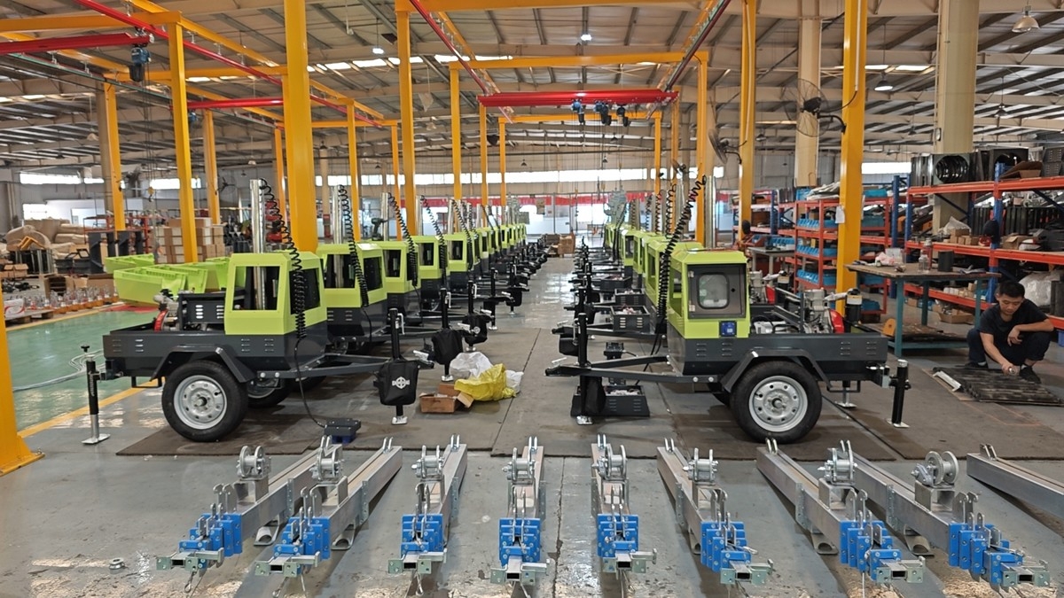 某國外客戶經過考察對比,先購買我廠3臺移動照明車進行試用,試用效果十分滿意,經過評估又繼續追加27臺,以下為生產裝配現場